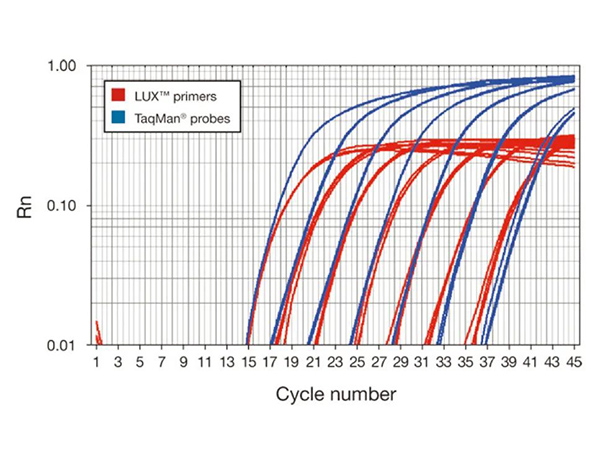 圖2.擴(kuò)增曲線顯示了設(shè)置不當(dāng)?shù)幕€ (A) 和設(shè)置正確的基線 (B)。閾值的設(shè)置Applied Biosystems?提供兩種閾值設(shè)置方法:自動(dòng)和手動(dòng)。自動(dòng)設(shè)置中,軟件將自動(dòng)選擇閾值,此閾值更適合平臺(tái)更高的曲線(圖3中的藍(lán)色曲線)。然而這將導(dǎo)致此數(shù)據(jù)組中的紅色曲線的 Ct 值出現(xiàn)偏差,因?yàn)槠渲良验撝?/p>