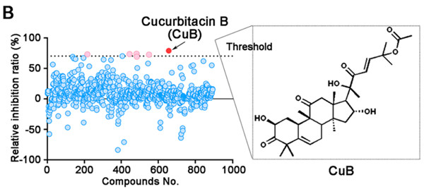 通過Biacore 8K的高通量抑制劑篩選實驗,作者得到了抑制劑篩選的排序。從圖2中可以直觀看出,六種具有較強抑制效果的天然產(chǎn)物被發(fā)現(xiàn),其中抑制效果最強的當(dāng)屬葫蘆素B(CuB)。在Huh增殖抑制實驗中,葫蘆素B同樣表現(xiàn)出了抑制作用,72h時的IC50達到1.0 uM。