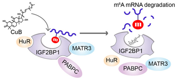 腫瘤免疫微環(huán)境(Tumor immune microenvironment ,TIME)調(diào)控因子IGF2BP1是一種關(guān)鍵N6 -甲基腺苷 (m6A) 閱讀蛋白,識別m6A靶點轉(zhuǎn)錄物,被認為是腫瘤治療的潛在靶點。2022年曾克武教授和屠鵬飛教授團隊發(fā)表的研究成果中,發(fā)現(xiàn)了天然產(chǎn)物葫蘆素B通過結(jié)合IGF2BP1發(fā)揮抗腫瘤作用,并且闡釋了作用機制。
